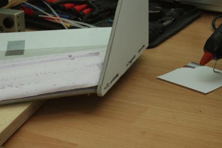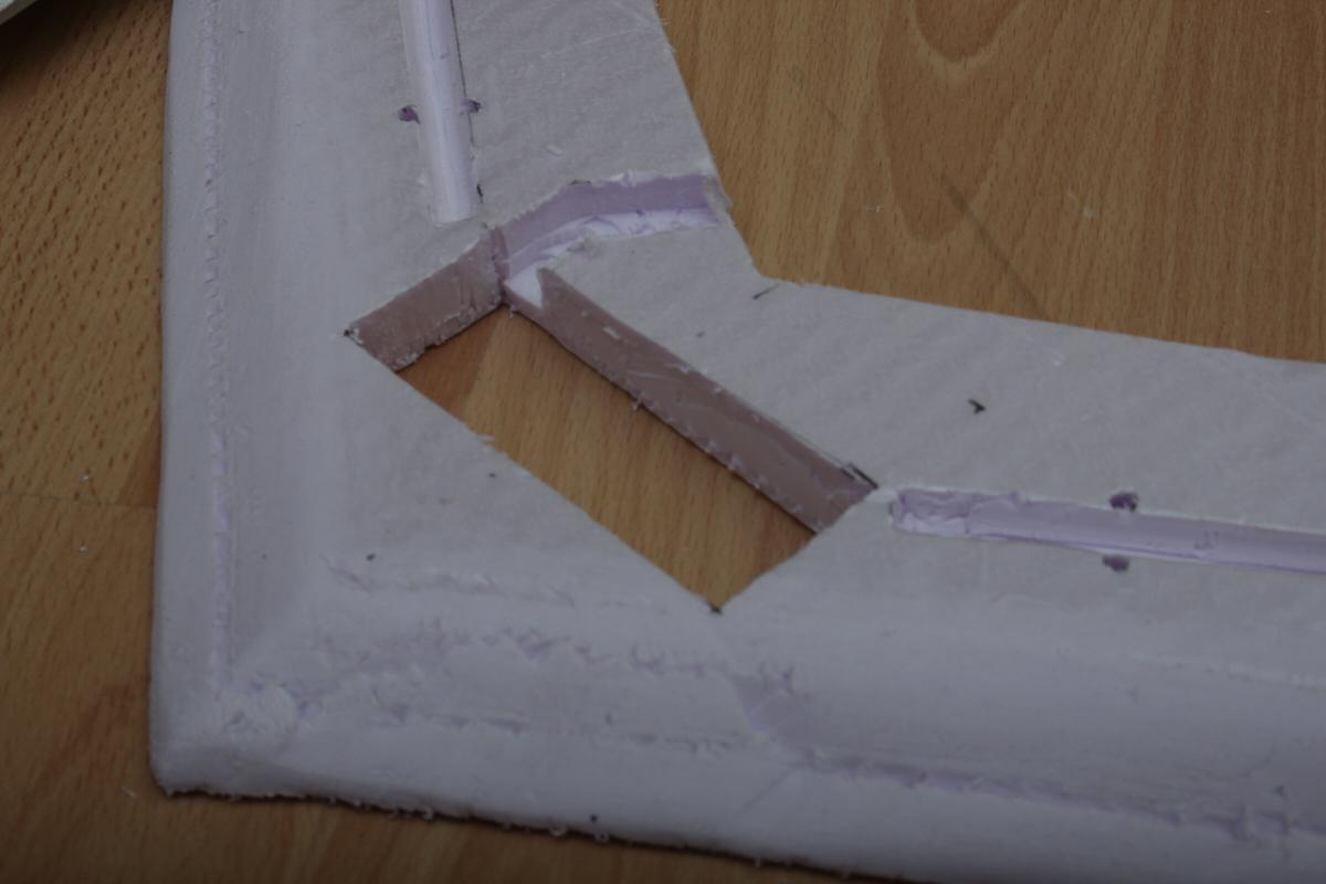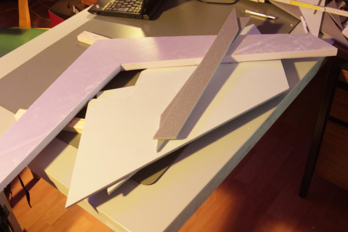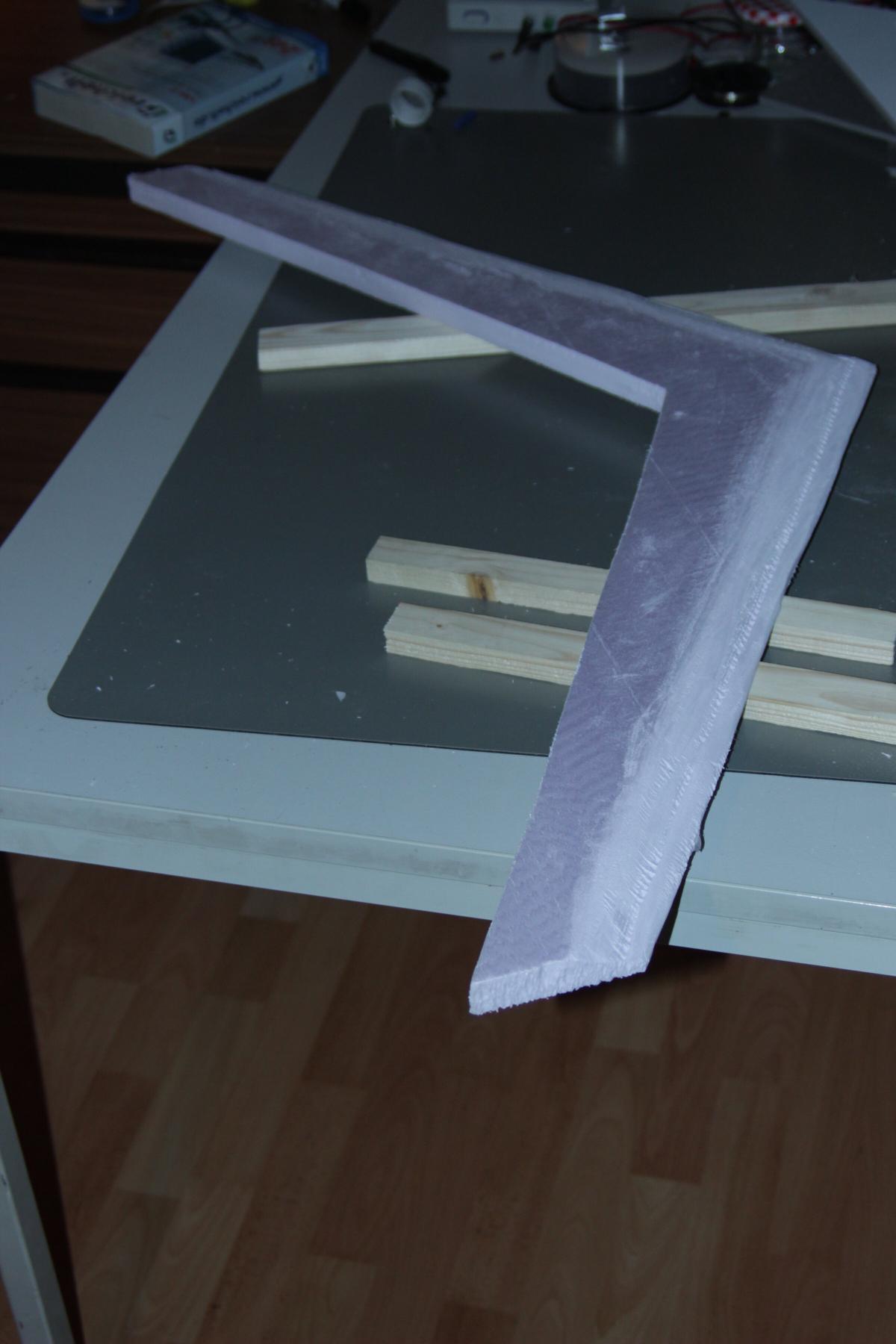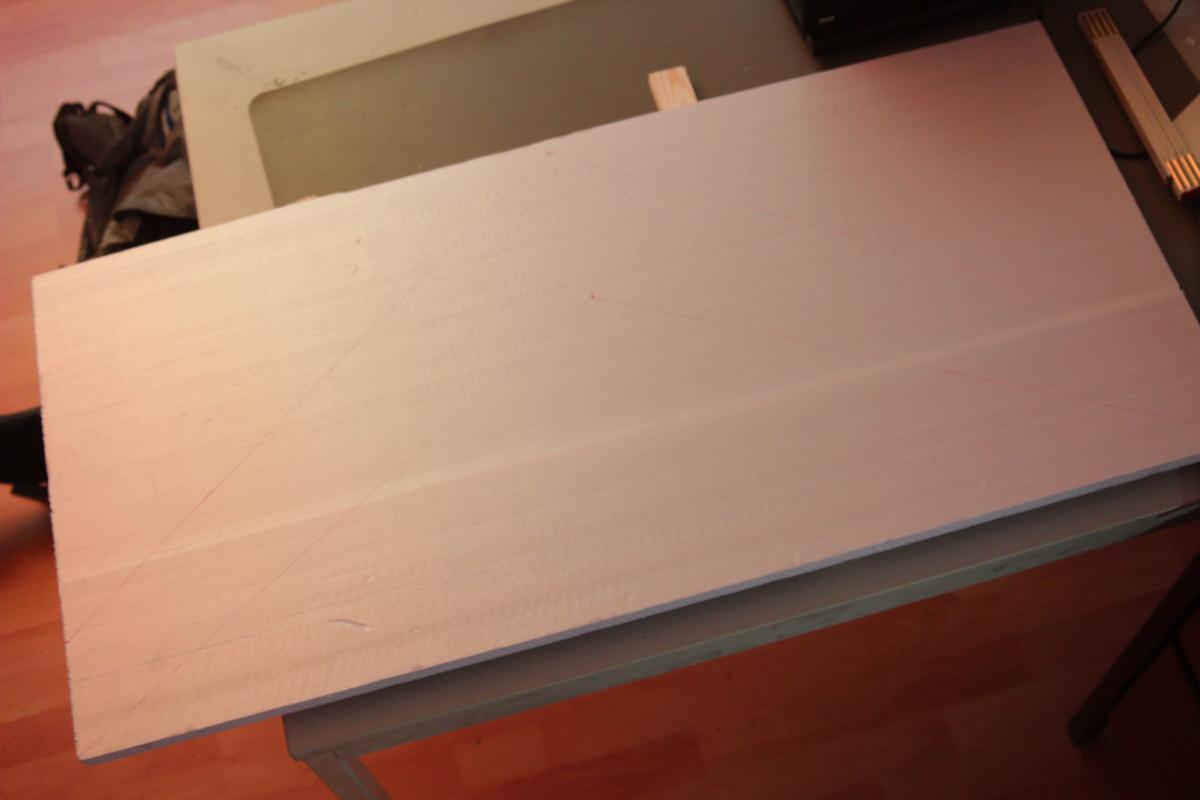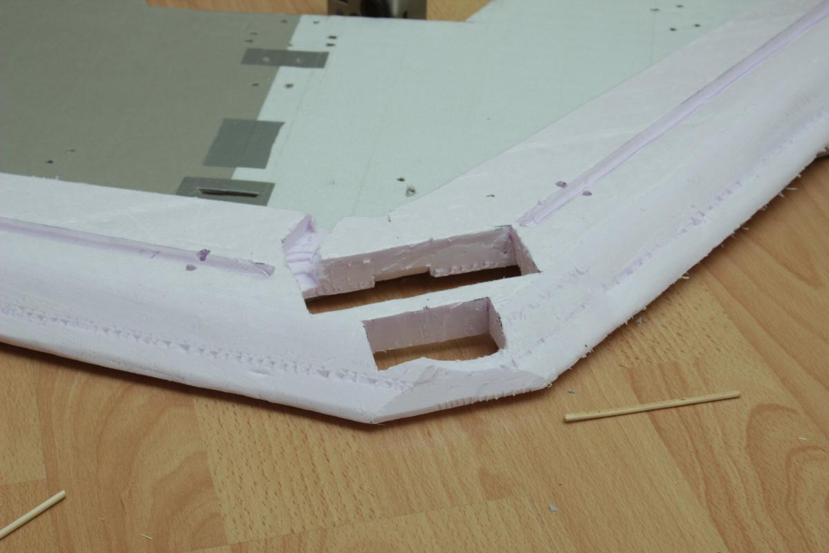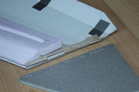 Das Domodur kommt auf das Saarpor und bildet die Tragfläche. Die Vorderkante hab ich mit einem Messer und Schleifpapier aus nicht nur optischen Gründen abgeschrägt.