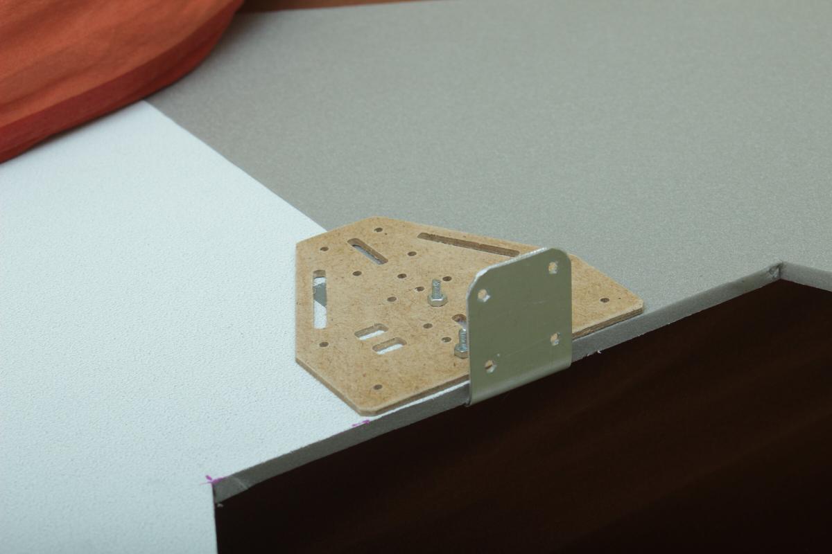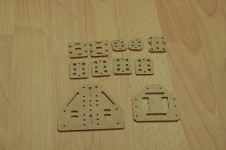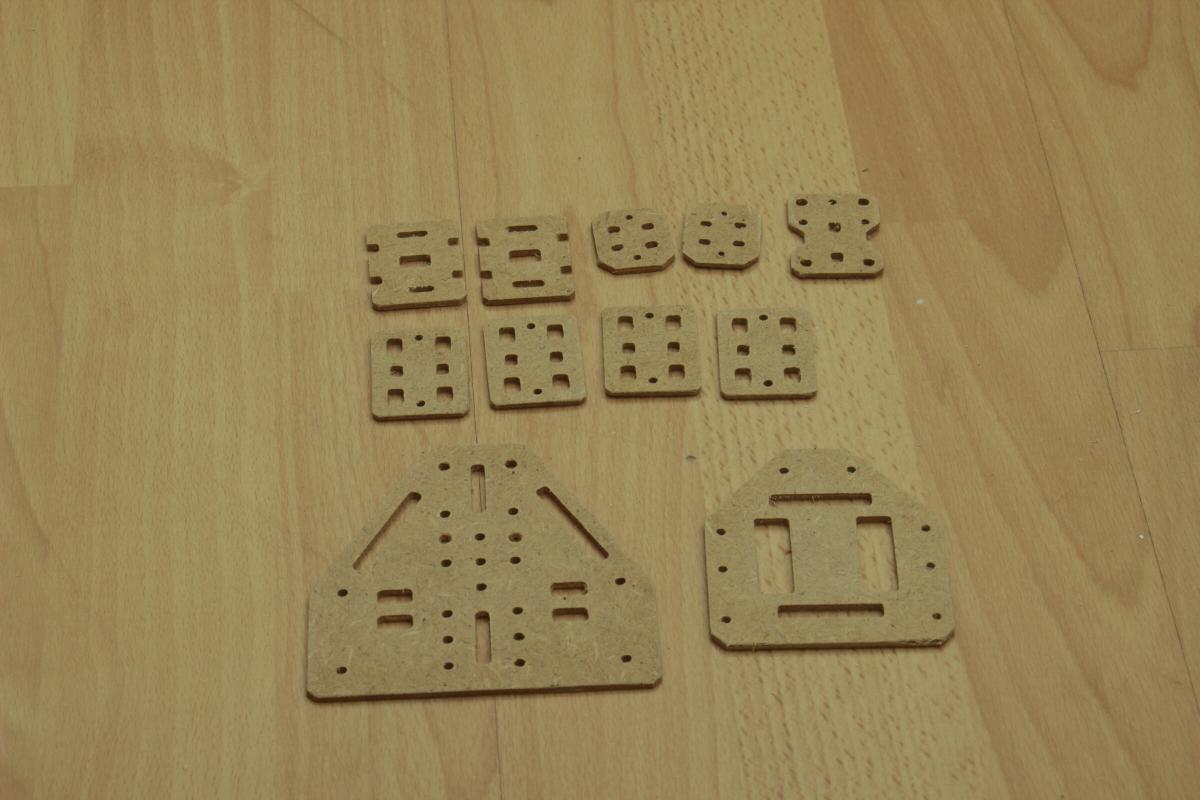 Der Motor wird an einem Aluwinkel angeschraubt, der wiederum von unten an einer 2.5mm MDF Platte angeschraubt ist. (DXF Files der CNC-Fräsungen siehe unten)