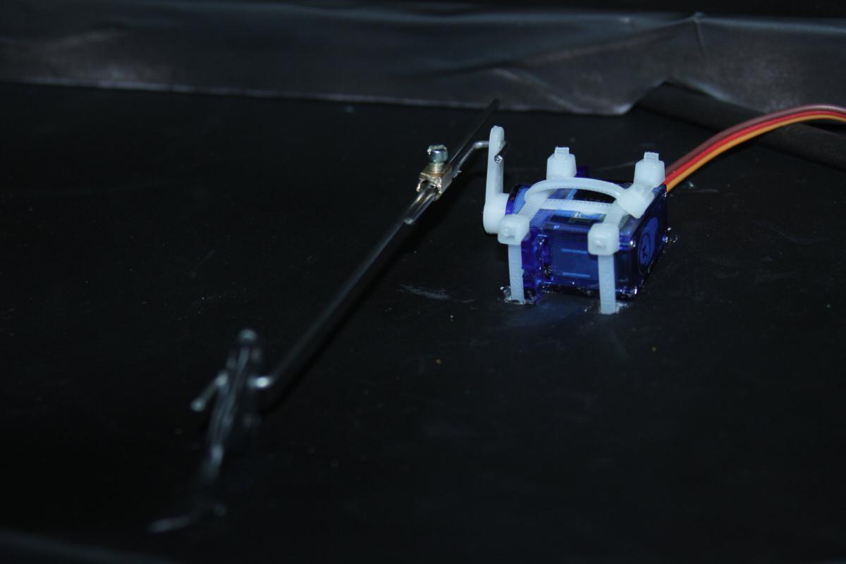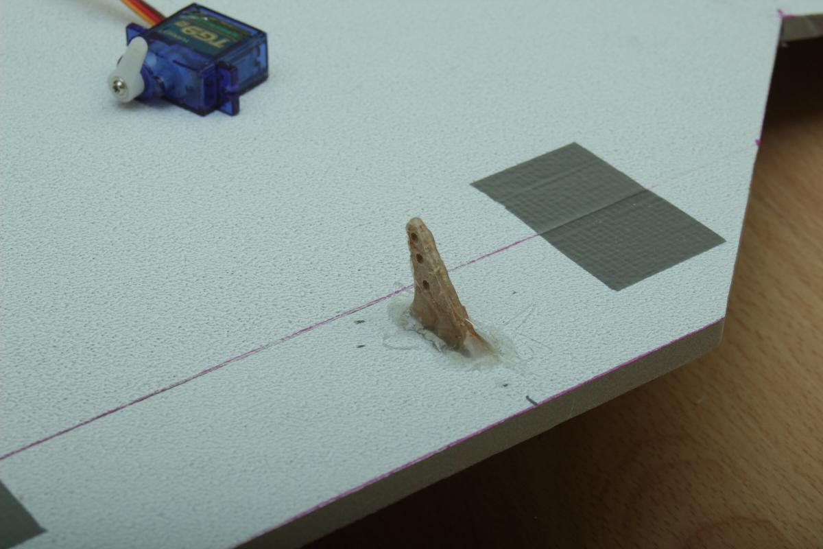 Daher sind die Servos auf der oberen Seite mit Kabelbinder befestigt. Unten musste eine kleine Holzplatte hin, damit die Kabelbinder nicht einfach nur das Saarpor durchschneiden.