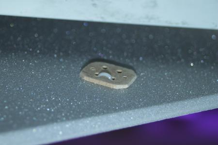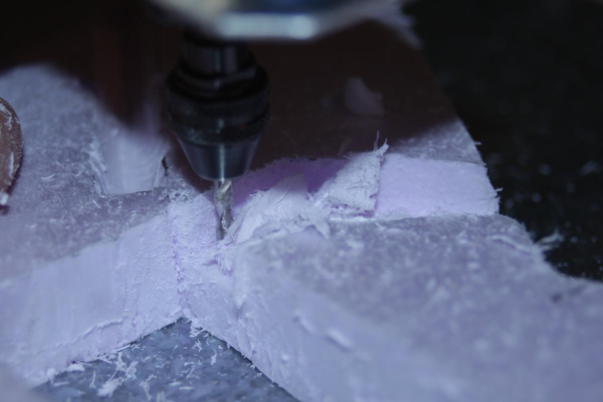 Daher wird er in das Domodur eingelassen und ragt nurnoch ein paar mm oben raus. Um die Kabel zum ESC zu führen musste ich einen kleinen Kanal einfräsen. Dazu einen alten abgebrochenen 3er Bohrer in den Dremel der CNC gespannt. Das Domodur konnte ich dann per Hand parallel zum Fräser bewegen und so etwa 1cm wegfräsen.