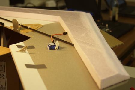 Die Elevons halten mit ein wenig Panzertape wunderbar. Zudem wird der ganze Flieger nachher eh komplett “eingepackt”.