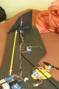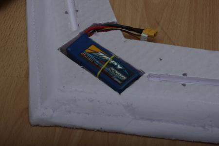 Der Lipo (aktuell ein 3S 2200 mAh) muss relativ weit nach vorne um den Schwerpunkt bei etwa 22cm (von der Spitze aus gemessen) zu halten.